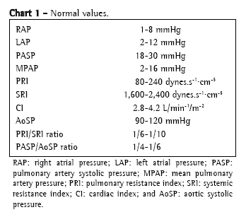 Transient alterations in pulmonary pressure and systemic pressure can cause errors in the interpretation of the results.(26) Simultaneous measurements and the comparison between them are more important than the analysis of the result in isolation. In order to avoid errors, arterial carbon dioxide tension, body temperature, catheter permeability and position, as well as the level of anxiety and sedation, should be controlled, and the first measurements should not be taken until at least 5 min after parameter stabilization.