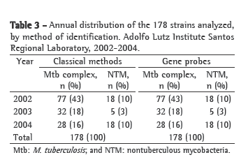 The tuberculosis referral laboratory in the greater metropolitan area of Santos, the IAL Santos Regional Laboratory, has used gene probes to identify M. tuberculosis complex mycobacteria since 2002.