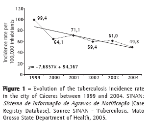 IntroductionTuberculosis (TB), notable for its magnitude, constitutes a serious public health problem in the current world. According to an estimate by the World Health Organization (WHO), one-third of the world population is infected with TB. Form 1997 to 1999, TB incidence increased by 6% per year. In 2002, approximately 80% of the new cases were concentrated in 22 countries, one of which is Brazil. Within this group, India ranks first, with 1,856,000 new cases, and Brazil ranks fifteenth, with approximately 116,000 new cases.(1) In 2003, the incidence rate of all forms of TB in Brazil was 40.76 per 100,000 inhabitants, with 72,949 new cases. In the central-west region, where 6.9% of the Brazilian population is concentrated, the incidence rate was 27.11 per 100,000 inhabitants, with 3394 diagnosed cases. In the state of Mato Grosso, in that same year, 1065 new cases were reported, which resulted in an incidence rate of 39.52 per 100,000 inhabitants.(2)