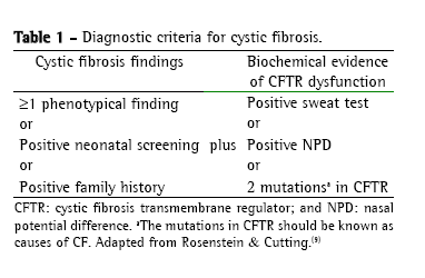 Table 1 shows the diagnostic criteria for CF. To be diagnosed with CF, an individual must present at leastonephenotypicalfinding(Chart1),haveafamily history of CF, or screen positive for CF in neonatal testing, as well as presenting laboratorial evidence of CFTR dysfunction - positive sweat test or positive nasal potential difference (NPD) - or have the two CFTR gene mutations known to cause CF.(5,9)
