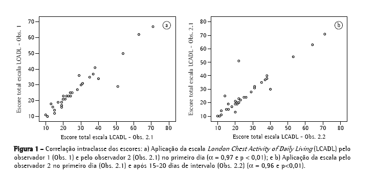 DiscussãoCom este estudo, observou-se que a versão brasileira da escala LCADL apresenta excelente confiabilidade tanto para aplicação por diferentes observadores quanto para aplicação por um mesmo observador em dois momentos. Essa versão também demonstrou ser válida, correlacionando-se com a distância percorrida no TC6 e com o VEF1.