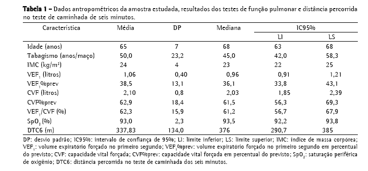 MétodosForam incluídos no estudo trinta e um indivíduos com diagnóstico de DPOC grave atendidos na Clínica Escola de Fisioterapia da Universidade do Vale do Itajaí, em Itajaí (SC) Brasil. Os critérios de inclusão foram: diagnóstico de DPOC grave, de acordo com os critérios do Global Initiative for Chronic Obstructive Lung Disease (GOLD),(1) e estabilidade clínica nas últimas quatro semanas. Os critérios de exclusão foram: presença de outras doenças não pulmonares consideradas incapacitantes, graves ou de difícil controle; exacerbação durante o período do estudo; incapacidade de compreensão da escala e incapacidade de realização do TC6.