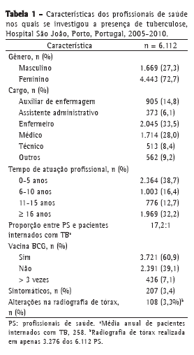 MétodosNeste estudo descritivo, o risco ocupacional de infecção por M. tuberculosis foi avaliado em 6.112 PS (Tabela 1) que trabalhavam ou estavam em treinamento no Hospital São João, na cidade do Porto, Portugal, entre 2005 e 2010. Com base nas diretrizes de 2005 dos Centers for Disease Control and Prevention (CDC) e levando em consideração o número de leitos, bem como a média anual de pacientes diagnosticados com TB (258 pacientes, com uma proporção entre PS e pacientes com TB de 17,2 para 1,0), o risco de contrair TB no hospital em questão foi considerado "moderado".(10) Os PS foram examinados quando da contratação e, a partir de então, anualmente. Exames ocasionais foram realizados em PS sintomáticos e em casos de contato contínuo com TB. Por meio de um questionário, coletamos dados relacionados a idade, gênero, setor de trabalho, tempo de atuação profissional na área da saúde, status de vacinação com BCG, sintomas e histórico de TB. Para cada PS, determinou-se o risco de transmissão de TB com base na classificação dos CDC(10): baixo - para PS que jamais serão expostos a pessoas que sabidamente têm TB ou nas quais há suspeita da doença ou a espécimes clínicos que possam conter M. tuberculosis; moderado - para PS que possam ser expostos a pessoas com TB ou a espécimes clínicos que possam conter M. tuberculosis; ou alto/contínuo - para PS que trabalhem em um setor no qual haja risco de transmissão interpessoal de M. tuberculosis ou evidência de tal transmissão (entre pacientes ou PS) no último ano.