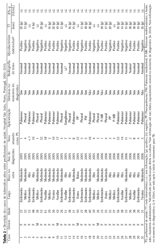 4. Saleiro S, Santos AR, Vidal O, Carvalho T, Costa JT, Marques JA. Tuberculose em profissionais de saúde de um serviço hospitalar. Rev Port Pneumol. 2007;13(6):789-99.