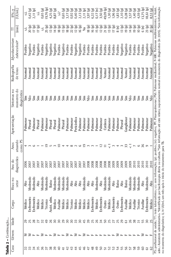 Os dados analisados neste estudo foram coletados como parte de um programa de rastreamento cujo objetivo foi identificar PS com infecção tuberculosa latente (ITBL) ou TB ativa. O rastreamento consistiu no seguinte: avaliação de sintomas respiratórios (tosse, escarro, hemoptise e dor torácica) e constitucionais (fadiga, anorexia, febre e hiper-hidrose); radiografia de tórax no momento da contratação, caso houvesse sintomas, e em PS que preenchessem os critérios para ITBL; e teste tuberculínico (TT) com 2 unidades tuberculínicas de PPD em 0,1 mL (RT23; Statens Serum Institut, Copenhague, Dinamarca), a menos que houvesse contraindicação (enduração prévia no TT ≥ 10 mm, diagnóstico prévio de TB com tratamento apropriado, infecção viral grave/imunização com vacina de vírus vivo no último mês, queimaduras extensas ou eczema). Desde 2007, o ELISA in vitro, baseado no IFN-gamma (IFN-) release assay (IGRA; QuantiFERON-TB Gold In-tube; Cellestis, Carnegie, Austrália), e o TT são realizados simultaneamente.