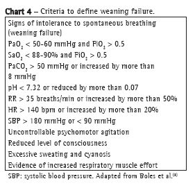 It is essential to identify the cause of MV weaning failure, in order to adopt a new approach that focuses on the triggering factor. Chart 4 shows the criteria for defining weaning failure.