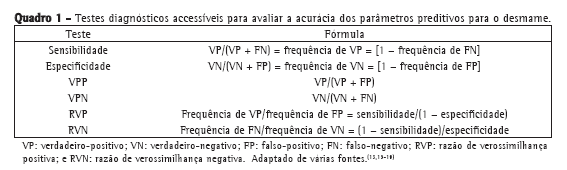 A RVP avalia a probabilidade de um índice positivo resultar no sucesso do DVM dividido pela probabilidade do mesmo índice resultar em falha no DVM.(16) Em outras palavras, a RVP expressa quantas vezes é mais provável encontrar um resultado de um índice positivo em pacientes desmamados comparados aos não desmamados.(16) A RVN avalia a probabilidade de um índice negativo resultar no sucesso do DVM dividido pela probabilidade do mesmo índice resultar em falha no DVM.(16) Em outras palavras, a RVN expressa quantas vezes é mais provável encontrar um resultado de um índice negativo em pacientes não desmamados comparados aos desmamados.(16) Uma RV entre 0,5 e 2,0 indica que o parâmetro está associado à pequena probabilidade pós-teste para o sucesso ou para a falha. Uma RV de 2,0-5,0 ou de 0,3-0,5 está associada a pequenas, mas importantes mudanças na probabilidade. Uma RV de 5,0-10 ou de 0,1-0,3 está associada a mudanças mais importantes na probabilidade. Uma RV acima de 10 ou abaixo de 0,1 está associada a grandes mudanças na probabilidade.(13) O Quadro 1 mostra os testes diagnósticos (os acessíveis) acima citados, com suas respectivas fórmulas.