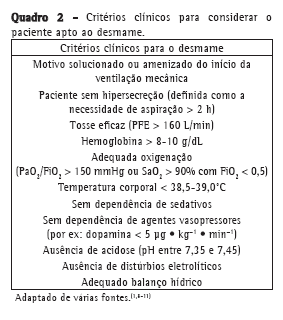 Início do DVM: avaliação clínica e parâmetros preditivosO paciente apto ao DVM deve apresentar ao menos os seguintes critérios: resolução ou estabilização da doença de base, adequada troca gasosa, estabilidade hemodinâmica e capacidade de respirar espontaneamente.(21) Preenchendo esses critérios, é recomendado que o TRE seja realizado.(1,7,8) Se a avaliação clínica não é favorável, os índices de DVM não apresentam utilidade.(22) Não há sentido em mensurar os parâmetros preditivos para o DVM caso o motivo de instituição da ventilação não tenha sido ao menos amenizado. No entanto, quando a avaliação clínica é favorável e os índices mostram um prognóstico positivo, as chances de sucesso são maiores.(22) A avaliação clínica isolada não prediz de forma acurada o resultado do DVM,(6,10) apresentando VPP e VPN de apenas 50% e 67%, respectivamente.(6,23) A avaliação clínica isolada não inclui a análise da mecânica respiratória, da demanda ventilatória e da força muscular respiratória, que são critérios importantes, sobretudo quando avaliados em conjunto. Os índices de DVM auxiliam na tomada de decisão em pacientes com risco elevado de falha.(7) Um determinado índice pode não ser muito acurado, mas em casos de valores extremamente desfavoráveis (por exemplo, PImáx > −15 ou −10 cmH2O), geralmente esse tem sua acurácia elevada. Os índices ainda são úteis em guiar a avaliação e o tratamento dos pacientes que falharam no DVM, identificando as causas de intolerância.(7) Mesmo que o fato de se completar o TRE possa predizer 85% da chance de sucesso no DVM,(6) aproximadamente 15% dos pacientes não toleram as 48 h após a extubação. Em um estudo,(24) a falha de extubação ocorreu em 121 dos 900 pacientes (13,4%) que completaram o TRE. Os critérios clínicos para avaliar se o paciente se encontra pronto para o DVM estão descritos no Quadro 2.