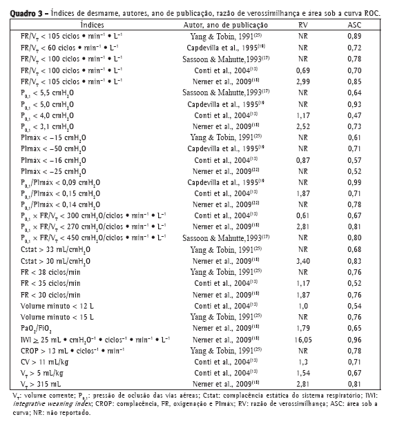 Índice ou parâmetro preditivo para o DVM constitui um critério que avalia alguma função fisiológica relacionada à respiração, objetivando identificar os pacientes que podem apresentar falha ou completar com sucesso o TRE.(15) Os índices de DVM devem ser avaliados antes do TRE, o qual funciona como um teste diagnóstico para determinar a probabilidade do sucesso da extubação.(8) Parâmetros integrativos são aqueles que avaliam mais de uma função fisiológica relacionada à respiração.
