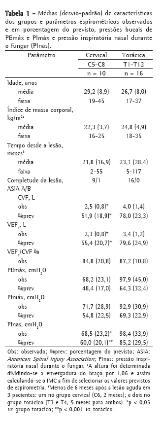 As complicações pulmonares são responsáveis por taxas elevadas de morbidade e mortalidade em pacientes tetraplégicos.(1) A lesão medular traumática (LMT) pode causar fraqueza e paralisia dos músculos respiratórios em graus variáveis, dependendo do nível e completude da lesão.(2,3) As investigações tradicionais usadas em pacientes com LMT são a espirometria e a determinação dos volumes pulmonares. Porém, vários fatores podem influenciar os resultados de PImáx e PEmáx,(4-7) e o valor da PImáx como um índice de capacidade inspiratória tem sido questionado.(6) Uma alternativa é determinar a pressão inspiratória nasal durante o fungar (PInas). Até o momento, não há estudos clínicos que avaliem o uso da PInas em pacientes com LMT. Porém, em pacientes com outras doenças neuromusculares, o valor prognóstico da PInas para a avaliação da força diafragmática mostrou-se comparável ao dos testes não-volumétricos e invasivos.(8-11) A determinação da PInas é um procedimento rápido, de fácil execução, e utiliza equipamento portátil. A fim de examinar a hipótese que a PInas pode detectar a redução da força dos músculos inspiratórios em pacientes com LMT, comparamos PInas, PImáx e outros parâmetros de função pulmonar em pacientes com LMT que apresentavam perda total da função motora, estratificando a amostra de acordo com o grau da lesão.