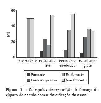 Independentemente da classificação da gravidade da asma, 53% da nossa população relatou exposição atual ou prévia à fumaça do cigarro. Essa taxa relativamente alta de exposição causa surpresa, pois o cigarro é uma conhecida causa de inúmeros problemas respiratórios.(6) O tabagismo causa diminuição da função pulmonar mesmo em pessoas sem doenças respiratórias prévias.(8) Exposições prolongadas podem causar bronquite e enfisema(9) e desencadear o aparecimento de doenças intersticiais,(10) além se ser o principal fator de risco para o aparecimento do câncer de pulmão.(9)