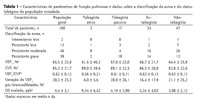 Portanto, com o objetivo de avaliarmos a prevalência de tabagismo ativo e passivo em pacientes asmáticos, realizamos um estudo transversal, aberto e não controlado. Uma amostra de 100 voluntários consecutivamente selecionados de uma população total de cerca de 900 pacientes que estavam em acompanhamento regular no Ambulatório de Asma do Serviço de Pneumologia do Hospital das Clínicas de São Paulo foi avaliada. Foram avaliados dados a respeito da classificação da asma, da história de tabagismo, bem como dados da medida de CO exalado através de um medidor de CO (Micro Medical Ltd., Rochester, Kent, Reino Unido) e de espirometrias simples de todos os pacientes.