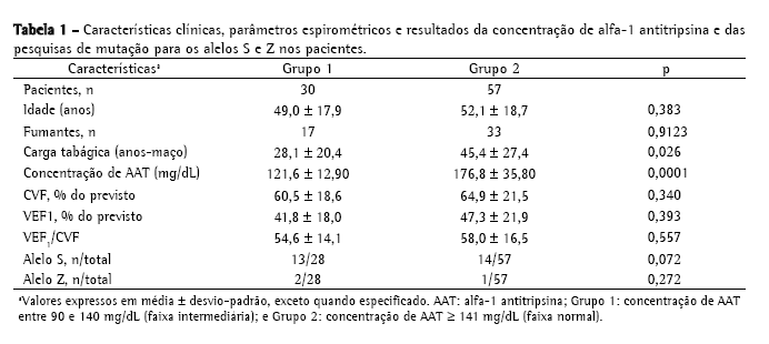 Apenas 2 pacientes apresentaram concentração menor que 89 mg/dL, número insuficiente para análise estatística; ambos eram heterozigotos compostos dos alelos S e Z, grandes fumantes (18 e 20 anos-maço) e portadores de DPOC. Um deles tinha insuficiência respiratória crônica e usava oxigenoterapia domiciliar, enquanto o outro apresentava história de exacerbações freqüentes e apresentava bronquiectasias na tomografia. Do total, 30 pacientes tinham níveis de AAT entre 90 e 140 mg/dL, constituindo o Grupo 1, e 57 apresentavam níveis acima de 141 mg/dL, formando o Grupo 2.