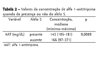 A análise da concentração de AAT nos pacientes dos Grupos 1 e 2 em conjunto, na presença ou não de mutação S (Tabela 2), mostrou diferença significativa nas medianas (p = 0,0089), com valores maiores no grupo sem mutação S.