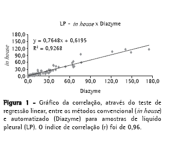 Os resultados do método convencional e do método automatizado foram submetidos aos testes de correlação (Figuras 1 e 2) e de concordância simples para atestar a equivalência entre eles,(17-19) considerando-se, para a confirmação de TB em amostras de LP, o valor de corte de 40 U/L para o método de Giusti modificado e de 30 U/L para o método automatizado. Para a confirmação de TB em amostras de LCR, considerou-se o valor de corte de 9 U/L para ambos os métodos (Tabela 3).