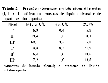 Os testes de precisão inter- e intra-ensaios foram satisfatórios com %CV adequados para as amostras de LP. No entanto, para as amostras de LCR, a %CV foi mais alta porque os níveis de atividade de ADA são menores em LCR do que nos outros líquidos cavitários. Além disso, trata-se de líquido muito menos rico em elementos protéicos e sabidamente apresenta diferenças enzimáticas e imunológicas mais instáveis, haja vista que para os mesmos níveis de atividade de ADA em LP (nível I) encontrou-se %CV maiores do que em LCR (níveis II e III).