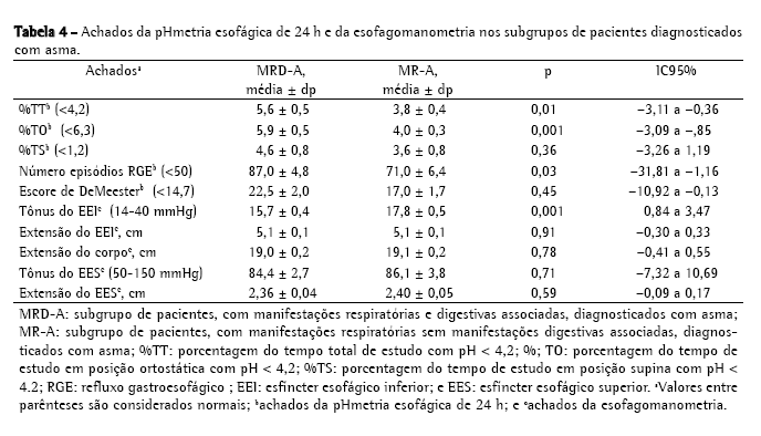 A hipotonia do EEI figurou como a anormalidade manométrica mais freqüente e também como a única estatisticamente significativa (p < 0,001). Em função disso, analisou-se a correlação entre hipotonia do EEI e os resultados anormais da pHmetria. Para os grupos MR e MRD, encontrou-se correlação significante em absolutamente todos os parâmetros. Na mesma comparação realizada dentre os que relataram asma, o subgrupo MR-A teve correlação significante entre hipotonia e tempo de exposição ao ácido em posição supina, o que elevou a níveis também significantes a percentagem de exposição no tempo total e o escore de DeMeester. Já no subgrupo MRD-A, foi o refluxo em ortostatismo que contribuiu significativamente para a elevação do tempo total de refluxo e, conseqüentemente, para a elevação do escore final de DeMeester (Tabela 4). O uso de broncodilatadores aparentemente não tem participação nestes achados, uma vez que foi demonstrado não haver modificação apreciável do tônus do EEI,(29) e que a presença do refluxo independe do uso da medicação.(30)