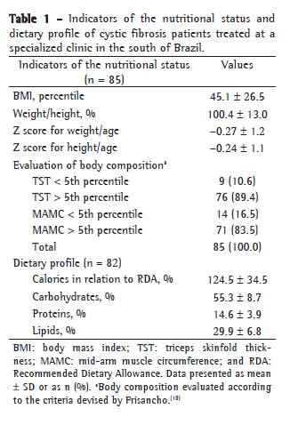 The pattern of dietary intake in CF patients seems to be directly related to their growth and to nutritional status. However, height can also be related to survival in these patients.(6) This study aimed to determine the relationship between nutritional status and dietary intake of CF patients aged 6-18 years and treated at a referral center in Brazil.