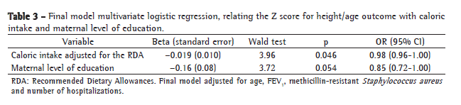 As can be seen in Table 3, the 1% increase, in relation to the RDA, in caloric intake (when adjusted for age, FEV1, colonization with MRSA and number of hospitalizations), decreases the chance of height deficit by 2% (OR = 0.98; 95% CI: 0.96-1.00). Maternal level of education seems to influence the nutritional indicator related to growth, that is, having a mother who has had more years of schooling seems to have a protective effect on the nutritional indicator related to growth. However, in the multivariate analysis, this association remained only borderline significant (p = 0.054).