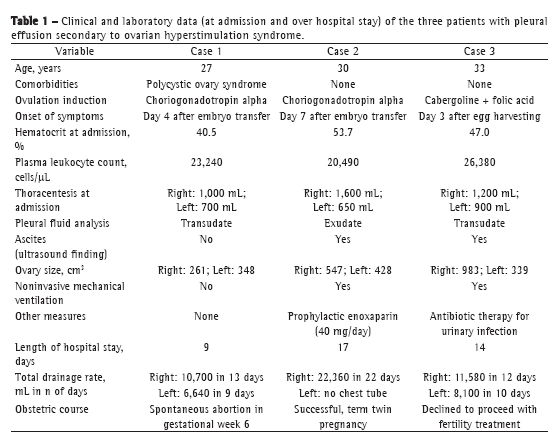 In most cases, the clinical manifestations of OHSS are self-limited and OHSS resolves spontaneously within a few days, provided that appropriate supportive measures are taken.(6,7) However, OHSS has been associated with substantial morbidity, principally acute respiratory distress, and fatal complications have been reported in patients with severe or critical OHSS.(8) Information regarding OHSS is not widely disseminated, being primarily restricted to studies published in journals specializing in gynecology and obstetrics or human reproduction. The purpose of the present report was to describe the clinical presentation, treatment, and course of pleural effusion secondary to OHSS in three patients who were treated by the same thoracic surgery team at two private, tertiary care hospitals in the city of São Paulo, Brazil. The institutional review boards approved the study, and the three patients gave written informed consent.
