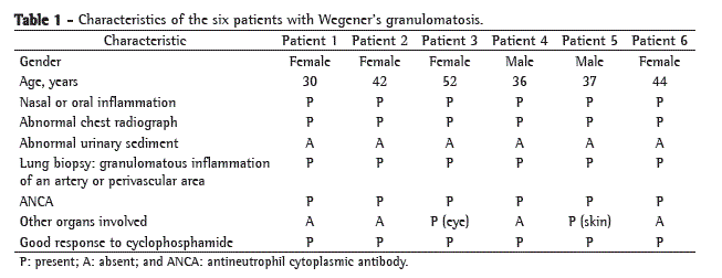 The patients were selected with a computer-aided search tool in order to identify all of the adults (≥ 18 years of age), during a six-year period (from January 1, 2000 to December 31, 2005), who had undergone surgical lung biopsy at the University of São Paulo School of Medicine Hospital das Clínicas, located in the city of São Paulo, Brazil, for the diagnosis of pulmonary/systemic diseases and who fulfilled the clinical and pathological criteria for the diagnosis of WG.(5) The search identified six patients with WG, whose chest CT revealed non-excavated nodules/masses, but no findings suggesting alveolar hemorrhage. In addition, the patients had no renal involvement, which was expected since, if they had had renal alterations, the biopsy would have been performed in the kidneys and not in the lungs, considering that lung biopsies have much higher morbidity and mortality risks than do renal biopsies.