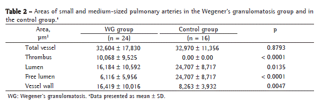 Objective: Wegener's granulomatosis (WG) can cause endothelial cell damage and thromboembolic events. Nevertheless, there have been few studies on the pulmonary microcirculation-small and medium-sized pulmonary arteries (SMSPA)-in patients with WG. The objective of this study was to quantify fibrin thrombi in the SMSPA of patients with WG. Methods: We analyzed 24 SMSPA samples collected from six patients with WG and 16 SMSPA samples collected from four patients without WG. In all samples, we used the endothelial cell marker CD34 and confocal laser scanning microscopy in order to detect intravascular fibrin thrombi. We calculated the total vessel area, the free lumen area, and the thrombotic area. Results: The mean total vessel area was similar in the WG and control groups (32,604 µm2 vs. 32,970 µm2, p = 0.8793). Thrombi were present in 22 (91.67%) of the 24 WG group samples and in none of the control group samples (p < 0.0001; OR = 297; 95% CI: 13.34-6,612). The mean thrombotic area was greater in the WG group samples than in the control group samples (10,068 µm2 vs. 0.000 µm2; p < 0.0001). In contrast, the mean free lumen area was smaller in the WG group samples than in the control group samples (6,116 µm2 vs. 24,707 µm2; p < 0.0001). Conclusions: Confocal laser scanning microscopy revealed a significant association between pulmonary microvascular thrombosis and WG. This suggests a possible role of microvascular thrombosis in the pathophysiology of pulmonary WG, evoking the potential benefits of anticoagulation therapy in pulmonary WG. However, further studies are needed in order to confirm our findings, and randomized clinical trials should be conducted in order to test the role of anticoagulation therapy in the treatment of patients with pulmonary WG.
