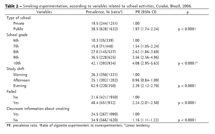 In relation to school activities and smoking experimentation, we observed that students from public schools are at greater risk of experimenting with smoking than are those who study in private schools. In addition, the probability of experimenting with smoking increases linearly with the advance of the adolescent to the subsequent grades. Similarly, studying in the evening, having been held back a school year and not having received any classroom instruction regarding smoking can all increase the probability of the adolescent experimenting with smoking (Table 2).