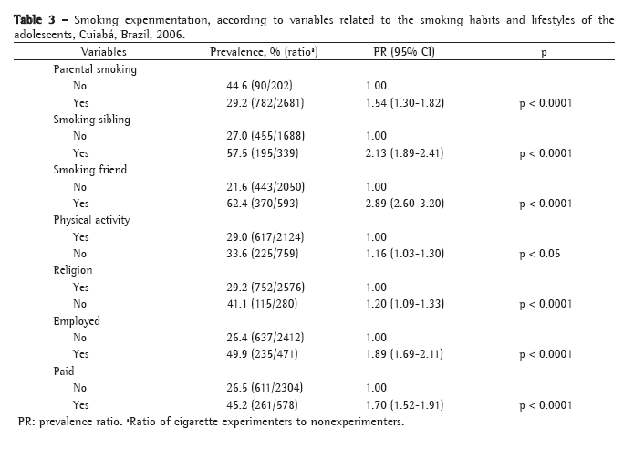 Objective: To assess the prevalence of and factors associated with smoking experimentation among adolescents. Methods: Cross-sectional study, using a specific questionnaire to interview 2,883 students from 7th to 10th grade in schools located in the urban area of the city of Cuiabá, in the state of Mato Grosso, Brazil. Prevalence was estimated, and the principal factors related to cigarette experimentation were analyzed. Subsequently, a hierarchical logistic model was used to describe the chances of cigarette experimentation related to the variables being investigated. Results: The prevalence of cigarette experimentation was 30.2%. In the final model of the analysis, the main variables related to cigarette experimentation were low maternal level of education (OR = 2.44; 95% CI: 1.72-3.47); low socioeconomic level (OR = 1.39; 95% CI: 1.01-1.93); studying in a public school (OR = 1.56; 95% CI: 1.22-2.00); being in 10th grade (OR = 3.45; 95% CI: 2.63-4.54); attending school in the evening (OR = 2.44; 95% CI: 1.85-3.22); having divorced parents (OR = 1.23; 95% CI: 1.02-1.49); having been held back for one school year (OR = 2.17; 95% CI: 1.78-2.70); having friends who smoke (OR = 3.75; 95% CI: 2.99-4.70) having a sibling who smokes (OR = 2.44; 95% CI: 1.82-3.27); and being older (age 17-19 years) (OR = 2.44; 95% CI: 1.39-4.17). Conclusions: A high proportion of adolescents have experimented with smoking. After adjusting for confounding variables, the factors most strongly associated with cigarette experimentation were maternal level of education, age of the adolescent, attending school in the evening, having been held back for one school year and having a sibling who smokes. Preventive measures must be directed at adolescents in schools in order to control smoking.