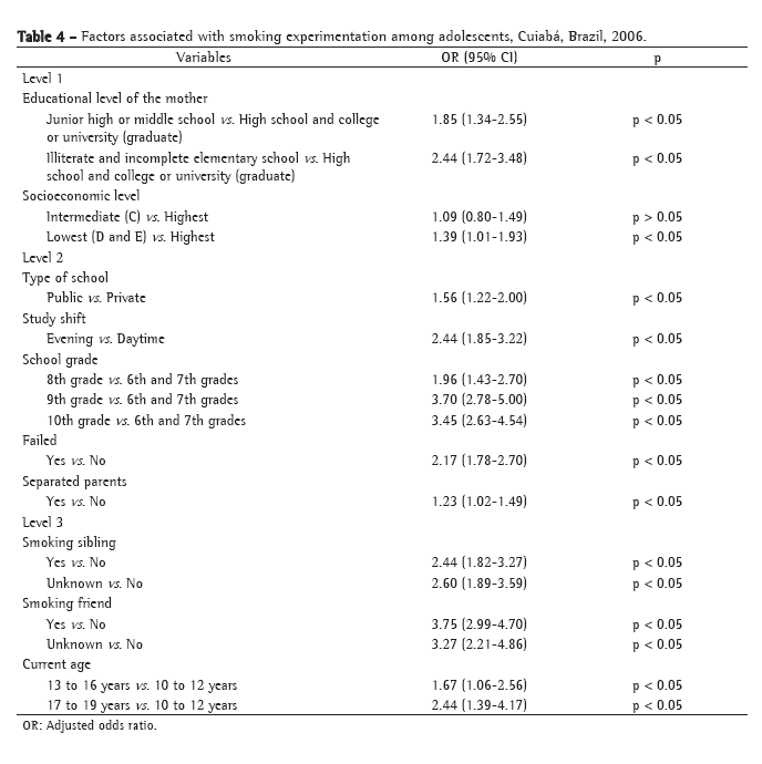 Adolescents who belonged to the lowest socioeconomic levels (D and E) had a 39% greater chance of experimenting with smoking than those who belong to families with higher socioeconomic level. In level 2, we observed that students from public schools with separated parents, studying in the evenings and in the most advanced grades have greater chances of experimenting with smoking than do those who study in private schools, whose parents are not separated, who study during the day and are in the 6th or 7th grade. Variables considered closest to the outcome were included in level 3. We observed that the chance of experimenting with smoking is two times higher for youths that have a sibling who smokes and more than three times higher for those who have a friend who smokes, when compared to those who have neither friends nor siblings who smoke. Similarly, as the adolescents grow older, the chance of experimenting with smoking increases.
