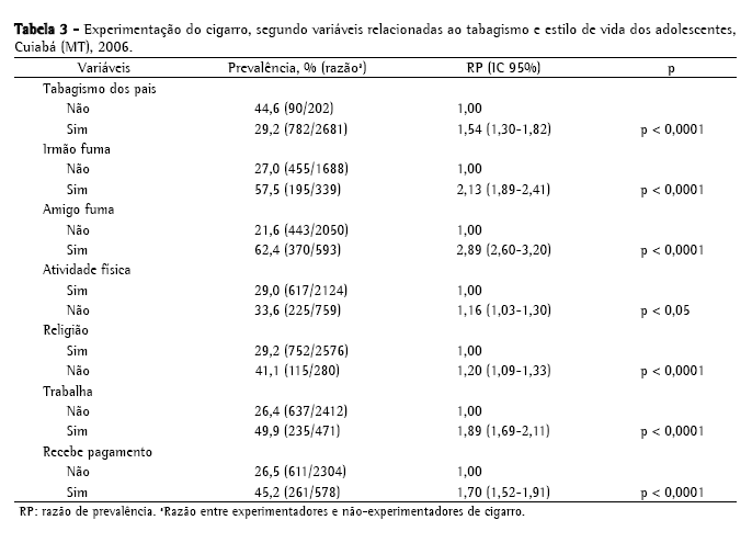 Dentre as variáveis relacionadas ao tabagismo e estilo de vida dos adolescentes, observou-se que aqueles que possuem pais fumantes têm uma probabilidade 54% maior de experimentar o cigarro do que aqueles cujos pais não fumam. Da mesma forma, aqueles que têm amigos e irmãos fumantes têm mais do que o dobro de probabilidade de experimentar o cigarro do que aqueles que não possuem irmãos nem amigos fumantes. O risco de experimentar o cigarro também aumenta para aqueles que não praticam atividade física, que não têm religião e que trabalham ou recebem algum tipo de remuneração (Tabela 3).