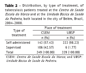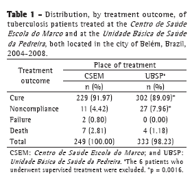 Objective: To analyze the treatment strategies that influence the effectiveness of tuberculosis treatment at primary care clinics (PCCs) in Brazil. Methods: This was a descriptive, retrospective epidemiological survey based on the medical records of 588 tuberculosis patients enrolled in the tuberculosis control programs at two PCCs located in the city of Belém, Brazil: Centro de Saúde Escola do Marco (CSEM) and Unidade Básica de Saúde da Pedreira (UBSP). The survey was limited to patients enrolled between January of 2004 and December of 2008. We included only patients between 18 and 59 years of age, and we excluded those who were transferred or were found to have been misdiagnosed. We collected data regarding age, gender, type of treatment (self-administered or supervised), co-infection with HIV, and treatment outcome. The health professionals involved in the tuberculosis control program at the two PCCs were interviewed regarding the strategies used for tuberculosis control and regarding routine clinical care for tuberculosis patients. Results: There were no significant differences between the CSEM and UBSP patients regarding age, gender, or co-infection with HIV. Supervised treatment was used significantly more frequently and the rate of cure was higher at the CSEM than at the UBSP, whereas the rate of treatment noncompliance was higher at the UBSP than at the CSEM. Conclusions: For patients enrolled in tuberculosis control programs at PCCs in Brazil, supervised treatment appears to be an extremely important strategy for reducing the rate of treatment noncompliance.