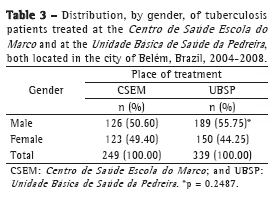 Several factors determine or influence adherence to tuberculosis treatment. Therefore, in addition to investigating the dynamics of care and the strategies used at the PCCs studied, we evaluated some of the characteristics of the population profile. In general, there were no significant differences between the CSEM and UBSP patients regarding gender, age, or co-infection with HIV. Males and patients in the 18-29 year age bracket predominated, and there was a low rate of co-infection with HIV.