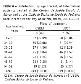This was a descriptive, retrospective epidemiological survey of male and female tuberculosis patients in the 18-59 year age bracket enrolled in the tuberculosis control programs at one of two PCCs: Centro de Saúde Escola do Marco (CSEM) or Unidade Básica de Saúde da Pedreira (UBSP). The survey was limited to patients who were enrolled between January of 2004 and December of 2008 and who completed the treatment (satisfactorily or not). We excluded all of the patients who did not meet the pre-established inclusion criteria, as well as those for whom there were missing data in the databases searched. In addition, we excluded those who were transferred (because they no longer constituted cases treated at the PCCs studied) and those who were found to have been misdiagnosed (because they no longer constituted cases of tuberculosis).