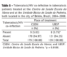 It is of note that the rate of tuberculosis/HIV co-infection was lower at the UBSP than at the CSEM. This is an important difference between the two PCCs, given that measures for prevention and control of HIV and tuberculosis cannot be considered separately. Tuberculosis/HIV co-infection should be identified at the beginning of treatment so that individualized follow-up procedures can be implemented.(20)