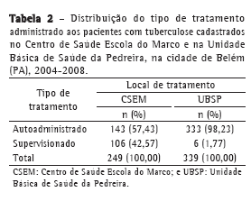 Objective: To analyze the treatment strategies that influence the effectiveness of tuberculosis treatment at primary care clinics (PCCs) in Brazil. Methods: This was a descriptive, retrospective epidemiological survey based on the medical records of 588 tuberculosis patients enrolled in the tuberculosis control programs at two PCCs located in the city of Belém, Brazil: Centro de Saúde Escola do Marco (CSEM) and Unidade Básica de Saúde da Pedreira (UBSP). The survey was limited to patients enrolled between January of 2004 and December of 2008. We included only patients between 18 and 59 years of age, and we excluded those who were transferred or were found to have been misdiagnosed. We collected data regarding age, gender, type of treatment (self-administered or supervised), co-infection with HIV, and treatment outcome. The health professionals involved in the tuberculosis control program at the two PCCs were interviewed regarding the strategies used for tuberculosis control and regarding routine clinical care for tuberculosis patients. Results: There were no significant differences between the CSEM and UBSP patients regarding age, gender, or co-infection with HIV. Supervised treatment was used significantly more frequently and the rate of cure was higher at the CSEM than at the UBSP, whereas the rate of treatment noncompliance was higher at the UBSP than at the CSEM. Conclusions: For patients enrolled in tuberculosis control programs at PCCs in Brazil, supervised treatment appears to be an extremely important strategy for reducing the rate of treatment noncompliance.
