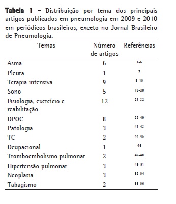 Foi realizada pesquisa on-line no PubMed e na base de dados do SciELO dos artigos publicados em 2009 e 2010 relacionados à pneumologia nos seguintes periódicos indexados no Journal of Citation Reports do Institute for Scientific Information: Revista da Associação Médica Brasileira, Clinics (Sao Paulo), Arquivos Brasileiros de Cardiologia e Brazilian Journal of Medical and Biological Research. Foram encontrados 56 artigos, e seu conteúdo está dividido nos tópicos conforme a Tabela 1.