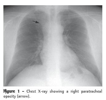 A 50-year-old male smoker (30 pack-years), a car salesman with a history of arterial hypertension and dyslipidemia, sought medical attention. The patient was under regular treatment with simvastatin (20 mg), valsartan (80 mg), lansoprazole (30 mg), and brotizolam (0.25 mg). The patient was referred to a pulmonologist due to the finding of right paratracheal lesion with enlargement of the upper mediastinum on a routine chest X-ray (Figure 1).