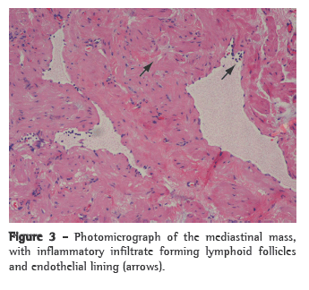 The treatment consisted of a right lateral thoracotomy to excise the right paratracheal cystic lesion, and the surgical sample was sent for anatomopathological examination. The macroscopic examination of the surgical sample revealed a thin-walled, nodular cystic lesion measuring 4.5 cm in its largest dimension. The lesion presented a smooth external surface, a whitish trabecular lining, and light yellow serous content. Under microscopy, it presented a fibrotic cystic wall and inflammatory infiltrate forming lymphoid follicles, with endothelial lining and with immunoreactivity to anti-CD34 serum (Figure 3).