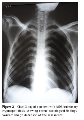 Pulmonary impairment is a rare complication of intestinal cryptosporidiosis, having been reported in immunocompromised patients, most of whom have AIDS and severe immunodeficiency.(2) The prevalence of pulmonary cryptosporidiosis, however, might be underestimated, given that it is not systematically investigated.(5) In a retrospective study conducted in Spain and investigating 275 AIDS patients, 43 had enteritis caused by Cryptosporidium spp.; in 7 of those 43 patients, sputum examination identified Cryptosporidium spp. oocysts.(3)