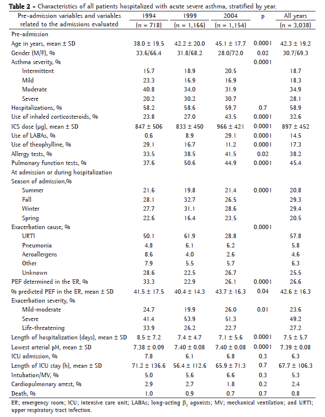The severe asthma patients hospitalized later in the study period presented less physiological severity, as evidenced by higher arterial pH at admission and higher percentage of predicted PEF in the emergency room. These trends have been reported previously.(5,9) In addition, we observed a trend toward a reduction of in-hospital mortality. The in-hospital mortality rate for all patients hospitalized during the three years studied was 0.8% (95% CI: 0.6-1.2), which is in accordance with previous estimates of in-hospital mortality at individual hospitals and in ICU units, as well as with nationally representative data.(9,10) Furthermore, there was a reduction in the frequency of cardiopulmonary arrest (2.9% in 1994, 2.7% in 1999 and 1.8% in 2004) although the difference was not statistically significant (p = 0.2).