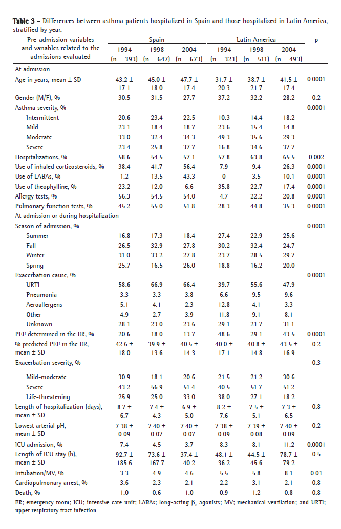 Patients hospitalized in Spain were more often submitted to pulmonary function tests and allergy tests than were those hospitalized in Latin America. Over the course of the study period, the patients hospitalized in Spain also presented an increase in the mean of the lowest arterial pH at admission, a significant reduction in the length of the hospital stay and a significant decrease in the frequency of ICU admission. Regardless of the degree of asthma severity, the proportion of patients receiving inhaled corticosteroids was higher among those hospitalized in Spain than among those hospitalized in Latin America. However, there were no differences between the two groups in terms of the frequency of cardiopulmonary arrest or the mortality rate.