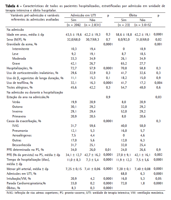 Dos 3.038 pacientes que foram hospitalizados durante os anos avaliados, 206 (6,8%) foram admitidos em UTI (Tabela 4). Esses pacientes, comparados aos que não foram admitidos em UTI, apresentaram maior gravidade da asma. Entre os pacientes admitidos em UTI, a proporção dos que haviam sido hospitalizados anteriormente, bem como a proporção dos que utilizavam teofilina, dos com história de pneumonia e daqueles cuja crise de asma havia sido desencadeada por aeroalérgenos, também foram maiores. Adicionalmente, as infecções de vias aéreas superiores foram menos comuns entre os pacientes admitidos em UTI. Embora a maioria das admissões em UTI tenha ocorrido durante o outono e o inverno, não houve diferença entre os pacientes admitidos em UTI e os não admitidos quanto à estação do ano na admissão. Os pacientes admitidos em UTI apresentaram maior gravidade da exacerbação (menor média de pH arterial, menor média de PFE e menor tempo de internação hospitalar), bem como maiores taxas de intubação/ventilação mecânica, parada cardiorrespiratória e óbito hospitalar.