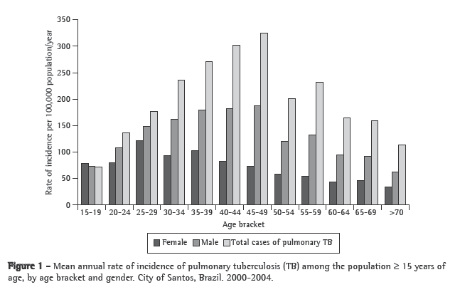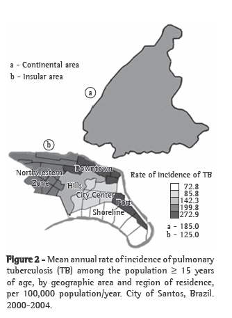 In the state of São Paulo, the 2004 rates of TB-related morbidity and mortality were close to the national average (41.9 and 2.5/100,000 population, respectively).(3) In addition, 53% of the new TB cases were concentrated in 10 of the 647 cities in the state of São Paulo; those in the greater metropolitan area of Santos were the most affected by TB, the city of Santos proper presenting morbidity and mortality rates far higher than the national average and therefore being the city in which the situation raises the most concern.(4)