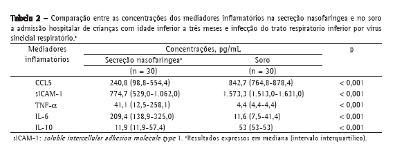 As medianas das concentrações de CCL5, sICAM-1 e IL-10, medidas no soro à admissão hospitalar das crianças com infecção por VSR, foram maiores do que aquelas na secreção nasofaríngea, de forma estatisticamente significante, enquanto as medianas das concentrações de IL-6 e TNF-α na secreção nasofaríngea foram significantemente mais elevadas (Tabela 2).