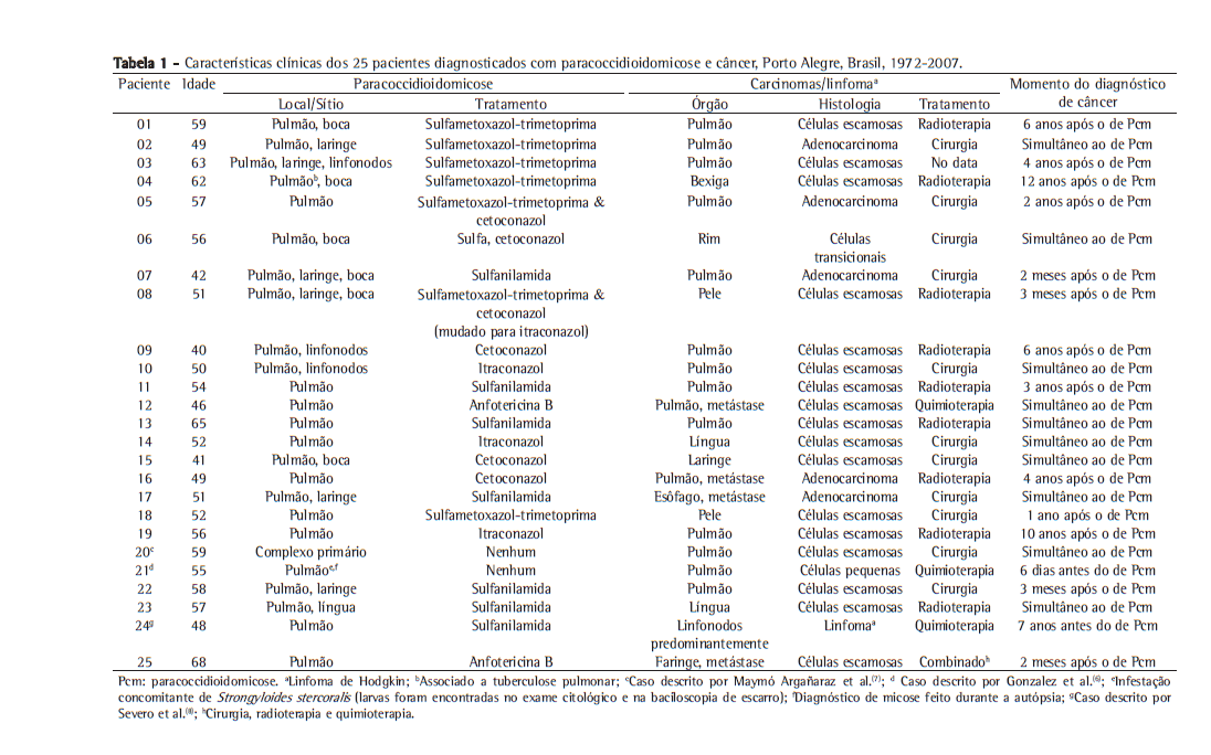 Foi feita uma revisão retrospectiva de 25 casos diagnosticados com Pcm e câncer, identificados em uma série de 808 casos consecutivos de pacientes adultos diagnosticados com Pcm com base nos testes realizados no Laboratório de Micologia da Santa Casa Complexo Hospitalar de Porto Alegre (RS), entre 1972 e 2007.