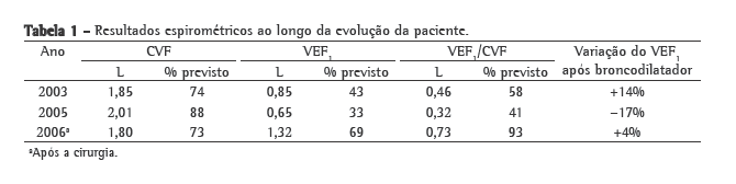 A espirometria realizada no sexto mês pós-operatório mostrou regressão do quadro obstrutivo (Tabela 1 e Figura 1c).