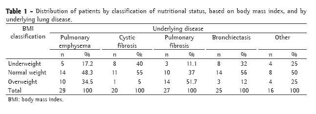 As can be seen in Table 1, the BMI was considered normal in 48.3% of the patients with PE, in 55% of those with CF, in 56% of those with bronchiectasis and in 50% of those with other lung diseases. In contrast, the majority (51.7%) of the patients with PF were classified as overweight.
