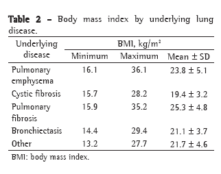 Absolute and relative frequencies, as well as the mean and the standard deviation of the variables analyzed, were calculated using the Statistical Package for the Social Sciences program, version 12.0 (SPSS Inc., Chicago, IL, USA). One-way ANOVA was used in the comparison between the BMI means and the different lung diseases. The level of statistical significance was set at p < 0.01.