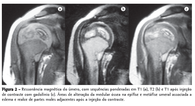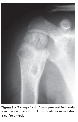 Menino de 21 meses, nascido em São Paulo, foi atendido com febre e leve comprometimento funcional do membro superior direito. A criança apresentava episódios de febre diária (acima de 38°C), predominantemente noturna. Uma semana antes da consulta, tinha iniciado com dor à palpação e à movimentação, bem como limitação de movimento do braço direito. A mãe negava história de trauma local. A radiografia do membro superior direito mostrou lesões osteolíticas na epífise e metáfise proximais umerais com bordas mal definidas, circundadas por áreas de esclerose óssea reativa, reação periosteal e aumento de partes moles (Figura 1). A ressonância magnética mostrou áreas de sinal medular anormal e edema de tecidos moles com realce pelo meio de contraste da medula infectada, sinais compatíveis com osteomielite no úmero proximal (Figura 2). O paciente recebeu cefalosporina por 10 dias em regime ambulatorial. No oitavo dia de antibioticoterapia, a criança veio a nosso serviço em virtude da febre e dor persistente.