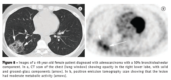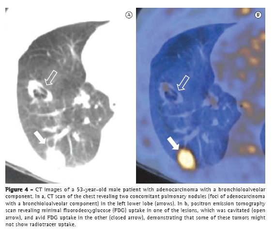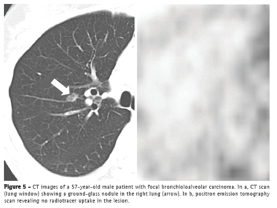 However, it is of note that pure BAC might not show increased 18F-fluorodeoxyglucose (FDG) uptake,(6) given that these tumors are usually indolent, slow growing, and well differentiated. Therefore, the lack of FDG uptake does not exclude the possibility of neoplasms, such as BAC, small lesions, and indolent cancers. Martins et al.(17) studied the diagnostic accuracy of PET in the assessment of solitary pulmonary nodules and obtained, among the 32 patients studied, only one false-negative result, a case in which the final diagnosis was BAC. Therefore, CT analysis is mandatory for the diagnosis (Figure 5).